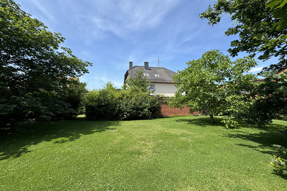 Der idyllische Garten ist mit einem Husqvarna Roboter ausgestattet und ist teils erweiterbares Bauland.